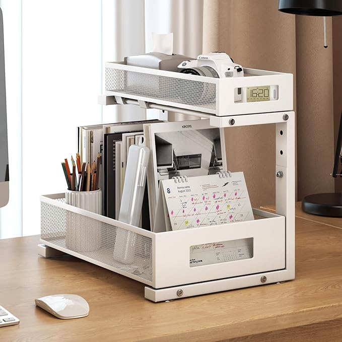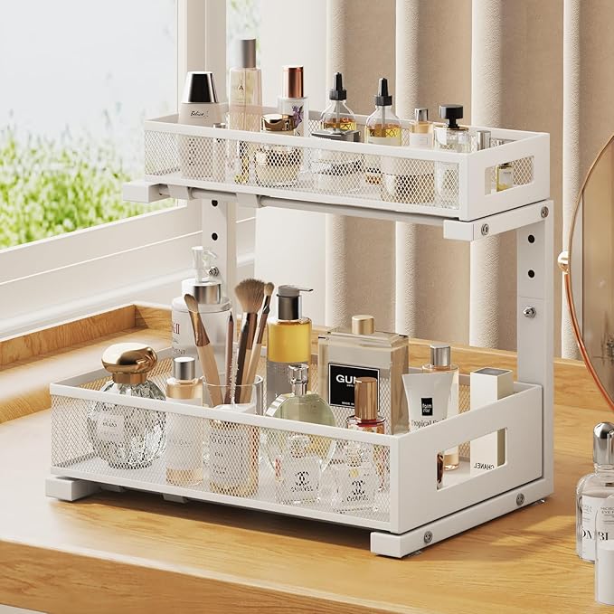 1 Pack-11.4"-16.14"H Under Sink Storage Organizer, Large 2-Tier Elegant Mesh Pull Out Shelf for Kitchen and Bathroom Cabinet Organization, L-Shaped and Adjustable Height Design for Maximum Space-White